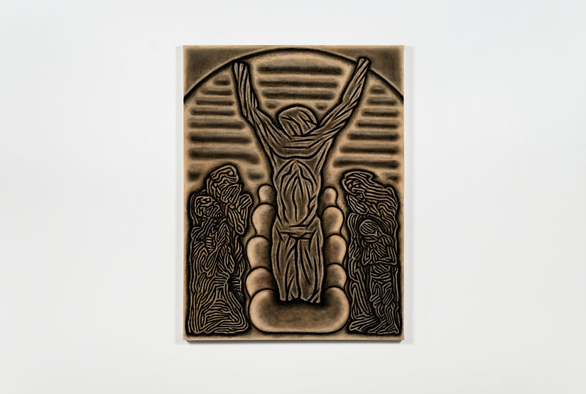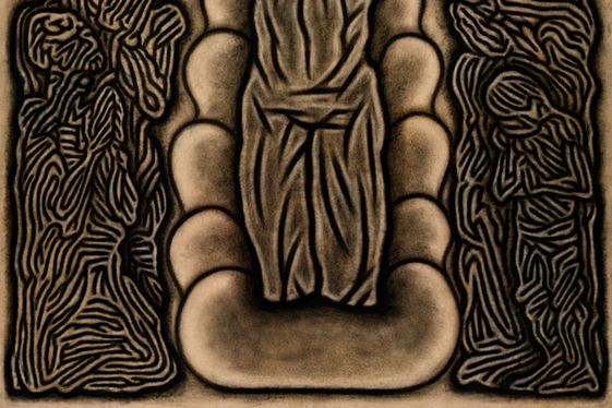 In the sky, the revered sacred statue has been shattered, yet still stands unyielding. On the ground, people each hold an invisible wire, exerting great effort to sustain the immortality of this exalted image.
